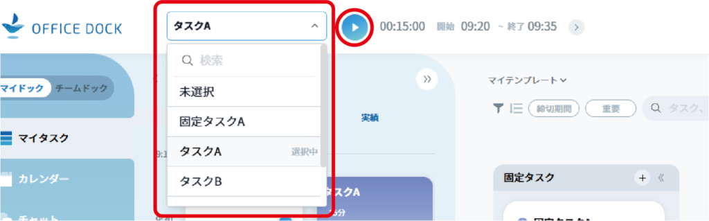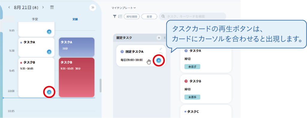①タスクカードの再生ボタンで計測の開始・停止が可能です。
