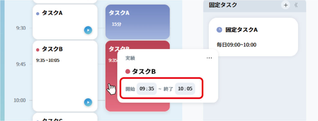実績のタスクカードにカーソルを合わせ、計測時間を修正します。