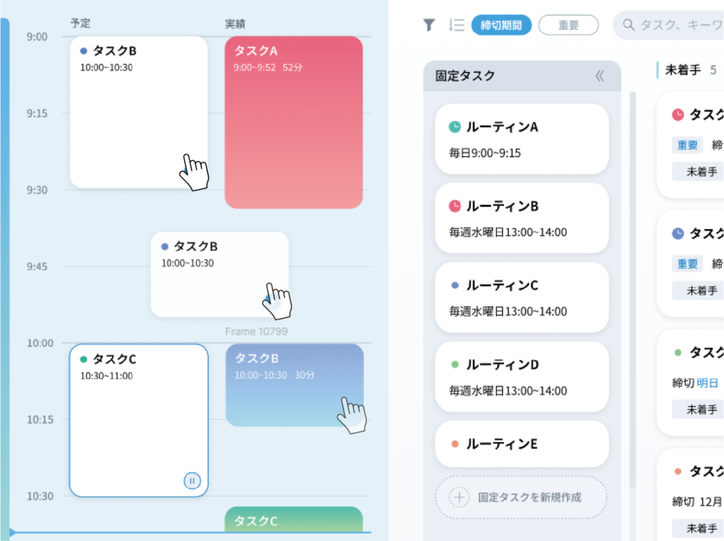 ②計測し忘れたタスクカードは、タスクカードを実績欄にドラック&ドロップすることで実績に追加されます。